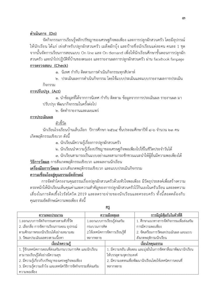 ด้วยสถานการณ์การแพร่ระบาดของเชื้อไวรัสโคโรนา ๒๐๑๙ ในสังคมปัจจุบันที่มีเพิ่มสูงขึ้น ทำให้ผู้ติดเชื้อต้องพักรักษาตัว และผู้ที่สัมผัสใกล้ชิดกับผู้ติดเชื้อมีความเสี่ยงสูง ต้องกักตัวดูอาการอยู่ที่พักอาศัยไม่สามารถออกไปประกอบอาชีพ หรือจับจ่ายซื้อสินค้าอุปโภค-บริโภคด้วยตนเองได้ เพื่อเป็นการป้องกันและลดการแพร่เชื้อ อีกทั้งร้านค้าหลายร้านได้ปิดตัวลงเนื่องจากได้รับผลกระทบจากการแพร่ระบาดของเชื้อไวรัสโคโรนา ๒0๑๙ และด้วยสภาพเศรษฐกิจที่ชะลอตัว ทำให้คนในชุมชนไม่สามารถทำงานได้ตามปกติ สินค้ามีราคาสูงขึ้น เพื่อเป็นการช่วยลดภาระการใช้จ่ายในครอบครัว จึงได้จัดการเรียนการสอนวิชาการงานอาชีพ และจัดทำกิจกรรมพัฒนานวัตกรรมสร้างสรรค์คนดีด้านการเรียนการสอนเพื่อส่งเสริมคุณธรรมขึ้น ให้นักเรียนได้รู้จักการปลูกพืชผักสวนครัวและการอยู่อย่างพอเพียง เป็นการช่วยลดรายจ่ายจากการซื้อผักประกอบอาหารภายในครอบครัวได้