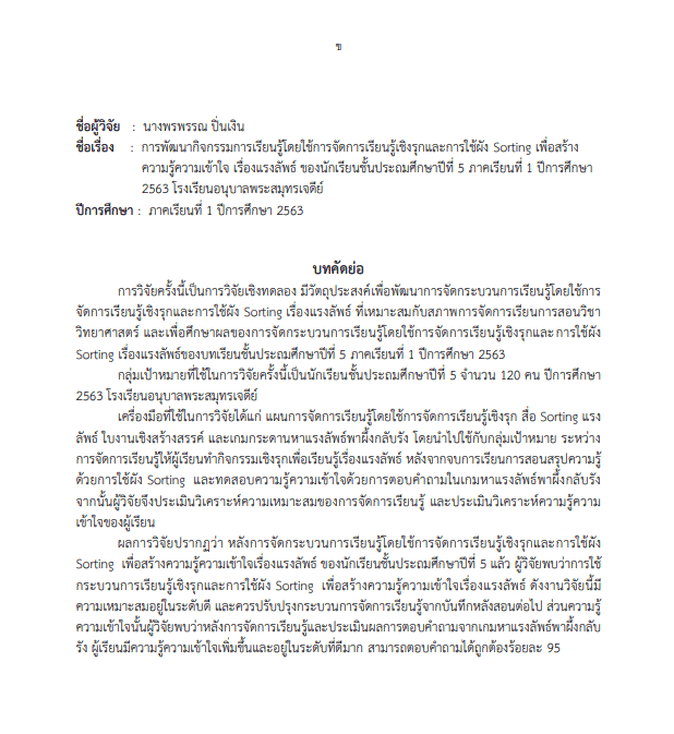 เผยแพร่ผลงานทางวิชาการ วิจัยในชั้นเรียน doc เรื่อง การพัฒนากิจกรรมการเรียนรู้โดยใช้การจัดการเรียนรู้เชิงรุกและการใช้ผัง Sorting เพื่อสร้างความรู้ความเข้าใจ เรื่องแรงลัพธ์ ของนักเรียนชั้นประถมศึกษาปีที่ 5 ภาคเรียนที่ 1 ปีการศึกษา 2563 โรงเรียนอนุบาลพระสมุทรเจดีย์ ไฟล์เวิร์ด แก้ไขได้ โดยสอนวิทย์ By Kroo BB