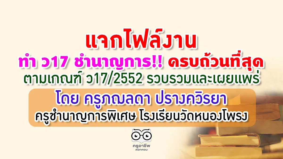 รวบรวมและเผยแพร่โดย ครูภฌลดา ปรางควิรยา ครูชำนาญการพิเศษ โรงเรียนวัดหนองโพรง บทความนี้ครูอาชีพดอทคอม ขอนำไฟล์ครบเครื่องเรื่องไฟล์งาน ทำวิทยฐานะ ตามหลักเกณฑ์ ว17 ชำนาญการ ตาม ว17/2552 รวบรวมและเผยแพร่โดย ครูภฌลดา ปรางควิรยา ครูชำนาญการพิเศษ โรงเรียนวัดหนองโพรง สพป.ปราจีนบุรี เขต 1 เผยแพร่โดย เพจ ฉันเป็นครู I am a Teacher มาฝากทุกท่านครับ