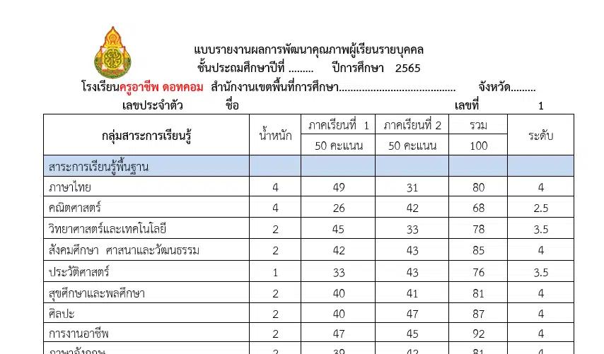 ดาวน์โหลดไฟล์ แบบรายงานผลการพัฒนาคุณภาพผู้เรียนรายบุคคล ปีการศึกษา 2565 ไฟล์ Word แก้ไขได้