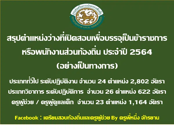สรุปตำแหน่งว่างเปิดสอบบรรจุ ข้าราชการหรือพนักงานส่วนท้องถิ่น ประจำปี 2564 (ครูผู้ช่วย / ครูผู้ดูแลเด็ก จำนวน 23 ตำแหน่ง 1,164 อัตรา) สรุปตำแหน่งว่างที่เปิดสอบเพื่อบรรจุเป็นข้าราชการหรือพนักงานส่วนท้องถิ่น ประจำปี 2564 ประเภททั่วไป ระดับปฏิบัติงาน จำนวน 24 ตำแหน่ง 2,802 อัตรา ประเภทวิชาการ ระดับปฏิบัติการ จำนวน 26 ตำแหน่ง 622 อัตรา ครูผู้ช่วย / ครูผู้ดูแลเด็ก จำนวน 23 ตำแหน่ง 1,164 อัตรา