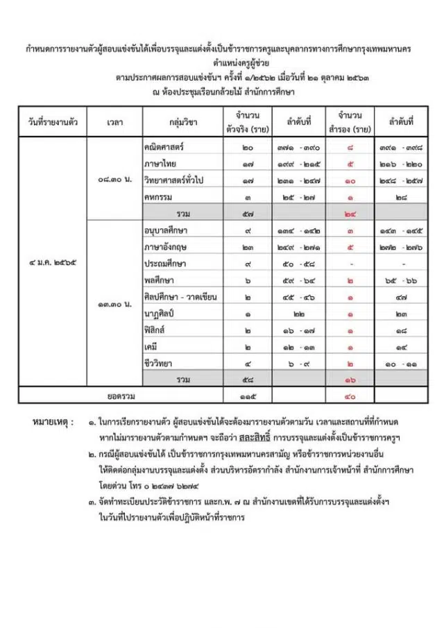 สำนักการศึกษา กรุงเทพมหานคร ประสงค์จะเรียกผู้สอบแข่งขันได้ ตำแหน่งครูผู้ช่วย ที่ขึ้นบัญชีตามประกาศสำนักงานคณะกรรมการข้าราชการกรุงเทพมหานคร ตามบัญชีสอบแข่งขันได้ฯ ครั้งที่ 1/2562 ลงวันที่ 21 ตุลาคม 2563 จำนวน 115 ตำแหน่ง 13 กลุ่มวิชา (ตัวจริง 115 อัตรา และสำรอง 40 อัตรา) ให้รายงานตัวเพื่อบรรจุและแต่งตั้งเป็นข้าราชการครูและบุคลากรทางการศึกษากรุงเทพมหานคร ในวันที่ 4 มกราคม 2565 ณ ห้องประชุมเรือนกล้วยไม้ สำนักการศึกษา กรุงเทพมหานคร
