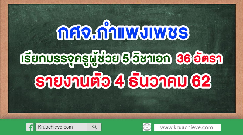 กศจ.กำแพงเพชร เรียกบรรจุครูผู้ช่วย 5 วิชาเอก รวม 36 อัตรา รายงานตัว 4 ธันวาคม 62 สำนักงานศึกษาธิการจังหวัดกำแพงเพชร เรียกผู้สอบแข่งขันได้ของ กศจ.กำแพงเพชร มาบรรจุและแต่งตั้งเข้ารับราชการเป็นข้าราชการครูและบุคลากรทางการศึกษา ตำแหน่งครูผู้ช่วย โดยให้ไปรายงานตัวในวันที่ 4 ธันวาคม 2562 เวลา 08.30 น. ณ สำนักงานศึกษาธิการจังหวัดกำแพงเพชร ถ.ปิ่นดำริห์ ต.ในเมือง อ.เมือง จ.กำแพงเพชร โดยนำเอกสารและหลักฐานตามที่แจ้งมาให้พร้อม หากไม่มารายงานตัวตามวัน เวลา และสถานที่ที่กำหนด ถือว่าสละสิทธิ์
