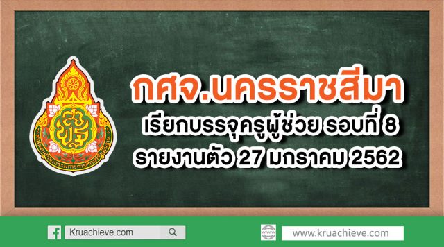 กศจ.นครราชสีมา เรียกบรรจุครูผู้ช่วย รอบที่ 8 รายงานตัว 27 มกราคม 2562 สำนักงานศึกษาธิการจังหวัดนครราชสีมา มีหนังสือ เรื่อง การรายงานตัวเพื่อบรรจุและแต่งตั้งบุคคลเข้ารับราชการเป็นข้าราชการครูและบุคลากรทางการศึกษา ตำแหน่งครูผู้ช่วย สังกัดสำนักงานคณะกรรมการการศึกษาขั้นพื้นฐาน ปี พ.ศ. 2561 รอบ 8