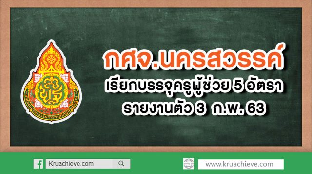 กศจ.นครสวรรค์ เรียกบรรจุครูผู้ช่วย 5 อัตรา รายงานตัว 3 ก.พ. 63 กศจ.นครสวรรค์ เรียกรายงานตัวผู้สอบแข่งขันได้ เพื่อเลือกสถานศึกษาที่จะบรรจุและแต่งตั้งเข้ารับราชการเป็นข้าราชการครูและบุคลากรทางการศึกษา ตำแหน่งครูผู้ช่วย จำนวน 5 อัตรา (แทนผู้สละสิทธิ์การบรรจุฯ เมื่อวันที่ 15 มกราคม 2563)ในวันจันทร์ที่ 3 กุมภาพันธ์ 2563 ณ ห้องประชุมแสงจันทร์ สำนักงานศึกษาธิการจังหวัดนครสวรรค์ รายละเอียดตามที่แนบ