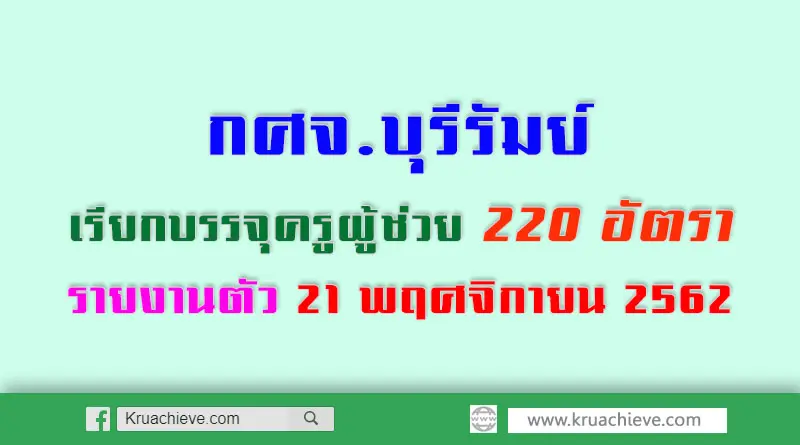 คณะกรรมการศึกษาธิการจังหวัดบุรีรัมย์ ประชุมครั้งที่ 12/2562 เมื่อวันที่ 8 พฤศจิกายน 2562 มีมติ”ให้เรียกตัวผู้สอบแข่งขันได้มาบรรจุและแต่งตั้งบุคคลเข้ารับราชการเป็นข้าราชการครูและบุคลากรทางการศึกษา ตำแหน่งครูผู้ช่วย สังกัดสำนักงานคณะกรรมการการศึกษาขั้นพื้นฐาน” รายงานตัววันพฤหัสบดี ที่ 21 พฤศจิกายน 2562 เวลา 08.30 น. ณ หอประชุมบัวชมพู โรงเรียนอนุบาลบุรีรัมย์ จำนวน 220 อัตรา รายละเอียดตามลิงก์ ดังนี้