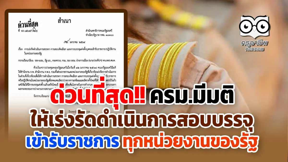 ด่วนที่สุด!! ครม.มีมติให้เร่งรัดดำเนินการสอบบรรจุเข้ารับราชการ ทุกหน่วยงานของรัฐ เมื่อวันที่ 14 มกราคม 2564 หนังสือราชการ ด่วนที่สุด ที่ นร 0505/ว 22 สำนักเลขาธิการคณะรัฐมนตรี ทำเนียบรัฐบาล เรื่อง การเร่งรัดดำเนินการสรรหา การสอบคัดเลือก และการบรรจุแต่งตั้งบุคคลเข้ารับราชการ/ปฏิบัติงานในหน่วยงานของรัฐ มีรายละเอียดดังนี้