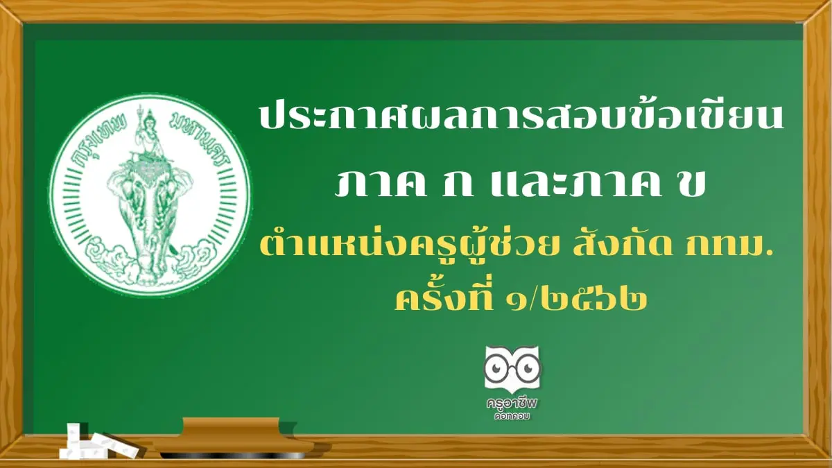 ประกาศผลการสอบข้อเขียน ภาค ก และภาค ข ตำแหน่งครูผู้ช่วย สังกัด กทม. ครั้งที่ ๑/๒๕๖๒ ประกาศสำนักงานคณะกรรมการข้าราชการกรุงเทพมหานคร เรื่อง ผลการสอบข้อเขียน ภาค ก และภาค ข เพื่อบรรจุและแต่งตั้งบุคคลเข้ารับราชการเป็นข้าราชการครูและบุคลกรทางการศึกษากรุงเทพมหานคร ตำแหน่งครูผู้ช่วย ครั้งที่ ๑/๒๕๖๒