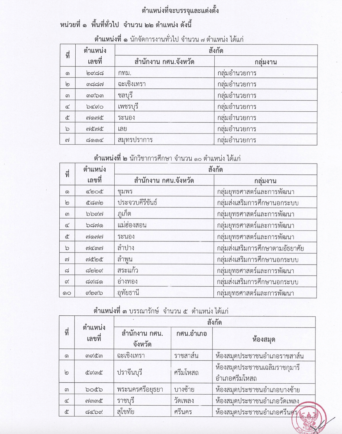 1) ตำแหน่งที่จะบรรจุและแต่งตั้ง จำนวน 23 ตำแหน่ง ดังนี้