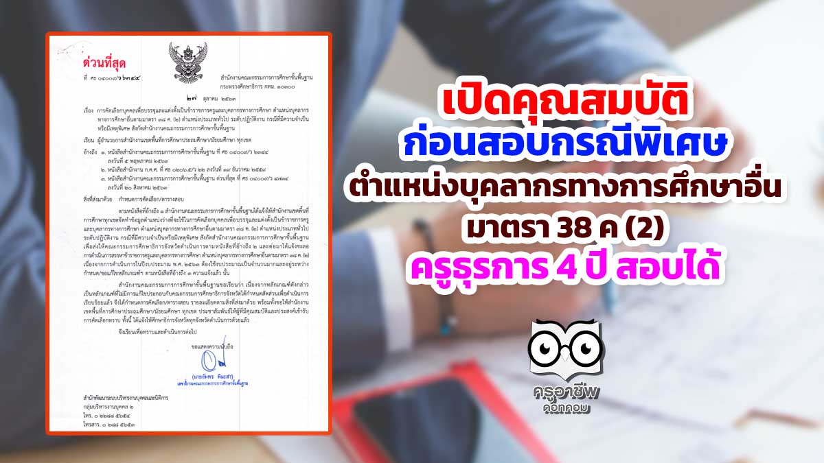 เปิดคุณสมบัติ ก่อนสอบกรณีพิเศษ ตำแหน่งบุคลากรทางการศึกษาอื่น มาตรา 38 ค (2) การคัดเลือกบุคคลเพื่อบรรจุและแต่งตั้งเป็นข้าราชการครูและบุคลากรทางการศึกษา ตำแหน่งบุคลากรทางการศึกษาอื่นตามมาตรา 38 ค.(2) ตำแหน่งประเภททั่วไป ระดับปฏิบัติงาน กรณีที่มีความจำเป็นหรือมีเหตุพิเศษ สังกัด สพฐ.