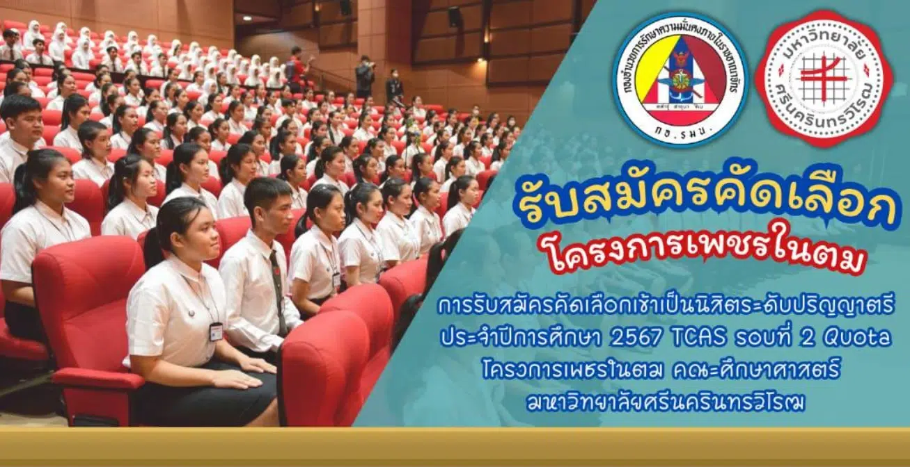 โครงการเพชรในตม คืออะไร มหาวิทยาลัยศรีนครินทรวิโรฒ มีความประสงค์จะรับสมัครบุคคลเพื่อคัดเลือกเข้าเป็นนิสิตระดับระดับปริญญาตรี ประจำปีการศึกษา 2567 TCAS รอบที่ 2 Quota โครงการเพชรในตม คณะศึกษาศาสตร์ มหาวิทยาลัยศรีนครินทรวิโรฒ เพื่อเข้าศึกษาต่อวิชาเอกการประถมศึกษา (เอกคู่) หลักสูตรการศึกษาบัณฑิต (รหัสสาขาวิชา 05005 รหัสกลุ่มสาขา 177) ตามโครงการความร่วมมือกับคณะศึกษาศาสตร์ มหาวิทยาลัยศรีนครินทรวิโรฒ และกองอำนวยการรักษาความมั่นคงภายใน ราชอาณาจักร และกระทรวงศึกษาธิการ ระหว่างวันที่ 13 – 29 กุมภาพันธ์ 2567 โดยใช้ผลการสอบ TGAT/TPAT5 และ A-level วิชาภาษาไทย ภาษาอังกฤษ และวิชาคณิตศาสตร์ประยุกต์ 1 ประจำปีการศึกษา 2567