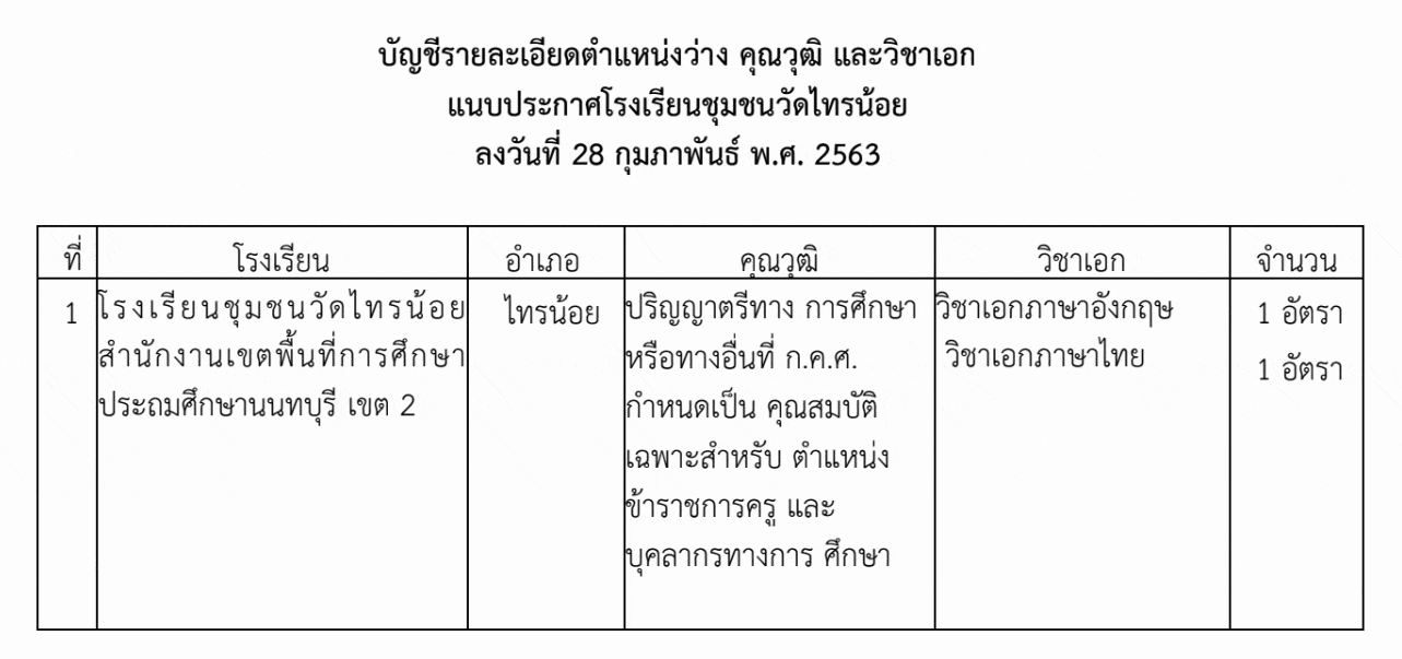 โรงเรียนชุมชนวัดไทรน้อย สพป.นนทบุรี 2 รับสมัครครูอัตราจ้าง 2 อัตรา สมัคร 6-12 มี.ค.2563 ประกาศโรงเรียนชุมชนวัดไทรน้อย เรื่อง การรับสมัครคัดเลือกบุคคลเพื่อเลือกสรรเป็นครูอัตราจ้าง งบประมาณองค์การบริหารส่วนจังหวัดนนทบุรี โดยมีรายละเอียดดังนี้
