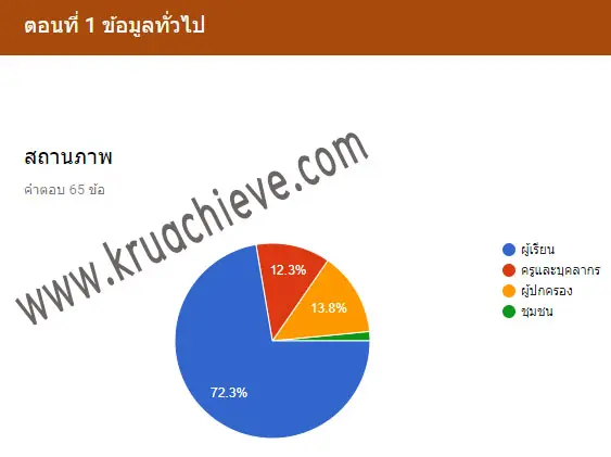 - ข้อมูลสรุป เมื่อผู้ตอบแบบสอบถามครบแล้วสามารถดูข้อมูลสรุปซึ่ง Google form จะ จะไป จะแสดง จะแสดงผลเป็น จะแสดงผลเป็นรูปแบบกราฟ แผนภูมิ ซึ่งสามารถบันทึกและนำไปใช้ได้ทันที