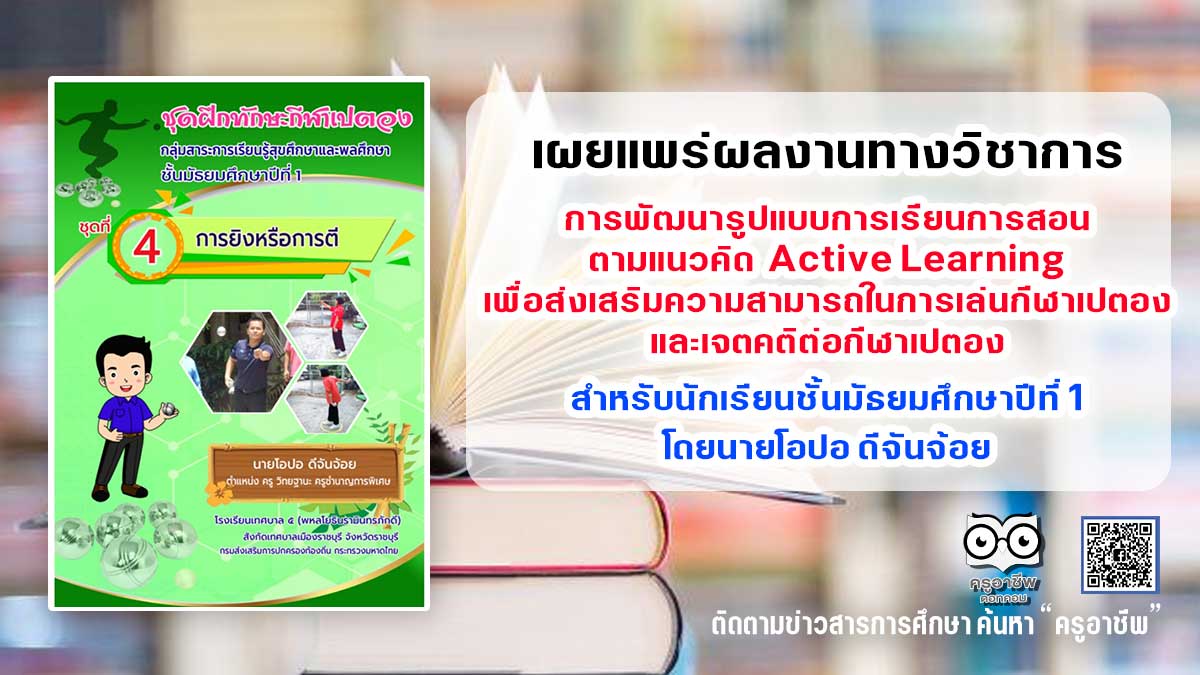 เผยแพร่ผลงานทางวิชาการ การพัฒนารูปแบบการเรียนการสอนตามแนวคิด Active Learning เพื่อส่งเสริมความสามารถในการเล่นกีฬาเปตอง และเจตคติต่อกีฬาเปตอง สำหรับนักเรียนชั้นมัธยมศึกษาปีที่ 1 โดยนายโอปอ ดีจันจ้อย