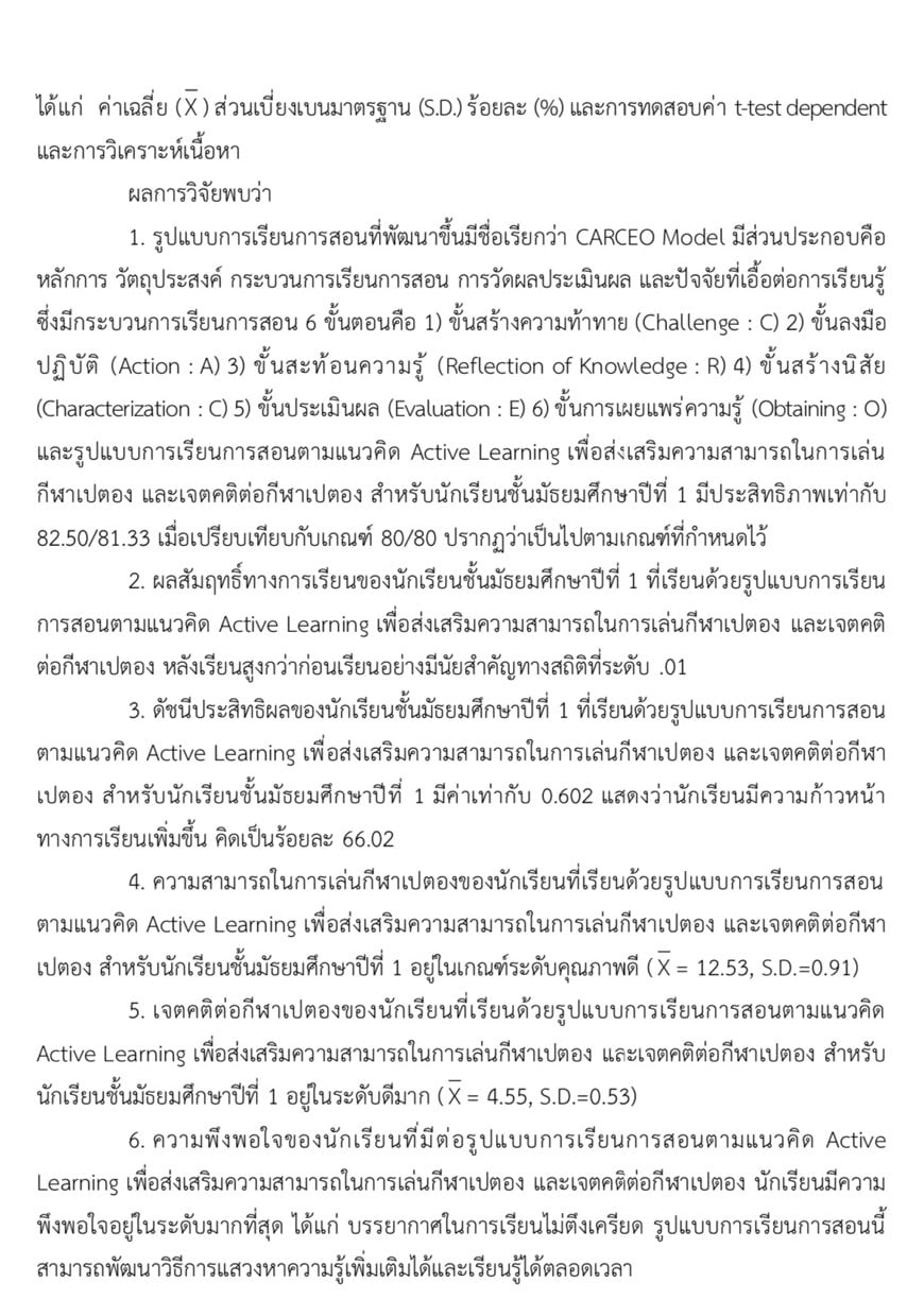 ชื่อเรื่อง การพัฒนารูปแบบการเรียนการสอนตามแนวคิด Active Learning เพื่อส่งเสริมความสามารถในการเล่นกีฬาเปตอง และเจตคติต่อกีฬาเปตอง สําหรับนักเรียนชั้นมัธยมศึกษาปีที่ 1