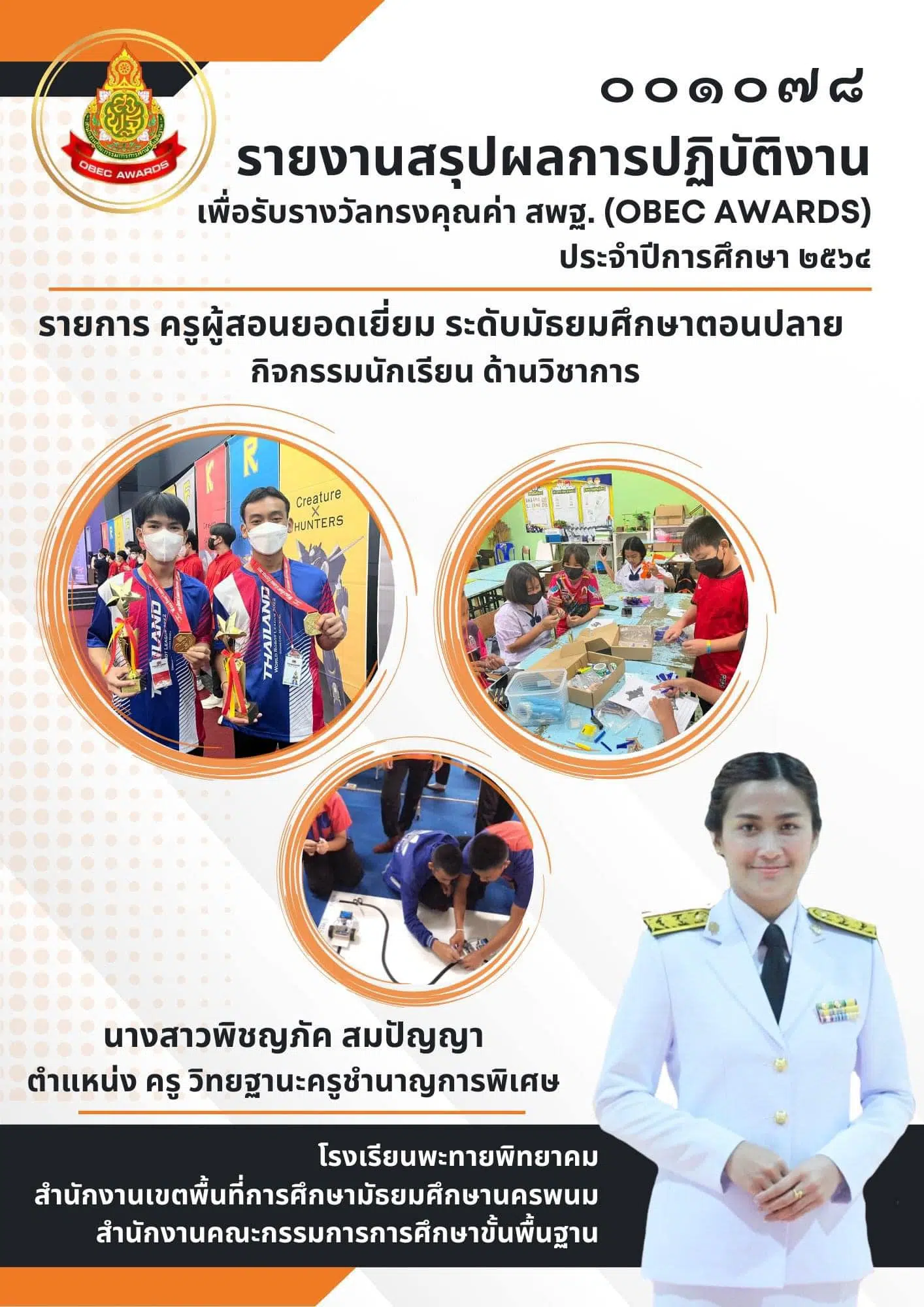 ดาวน์โหลดเอกสารรายงาน OBEC AWARDS ไฟล์ Word รางวัลชนะเลิศ รายการครูผู้สอนยอดเยี่ยม ระดับมัธยมศึกษาตอนปลาย กิจกรรมนักเรียน ด้านวิชาการ ระดับประเทศ ของครูพิชญภัค สมปัญญา