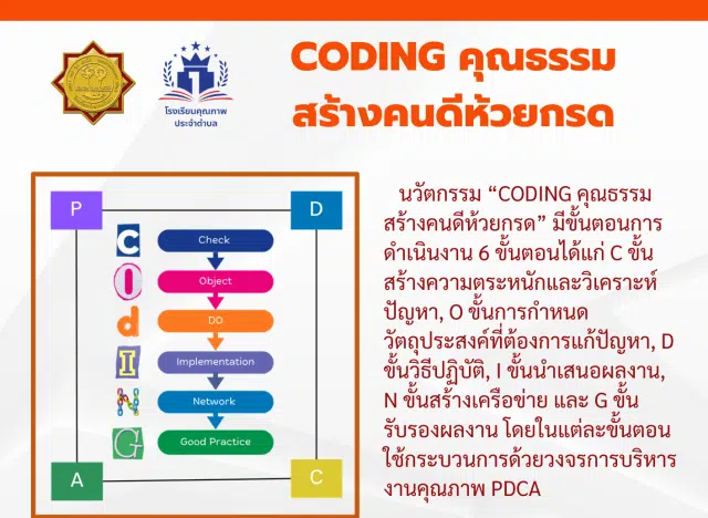 นวัตกรรม “CODING คุณธรรมสร้างคนดีห้วยกรด” มีขั้นตอนการดำเนินงาน 6 ขั้นตอนได้แก่ C ขั้นสร้างความตระหนักและวิเคราะห์ปัญหา, O ขั้นการกำหนดวัตถุประสงค์ที่ต้องการแก้ปัญหา, D ขั้นวิธีปฏิบัติ, I ขั้นนำเสนอผลงาน, N ขั้นสร้างเครือข่าย และ G ขั้นรับรองผลงาน โดยในแต่ละขั้นตอนใช้กระบวนการด้วยวงจรการบริหารงานคุณภาพ PDCA ดังแผนภาพ