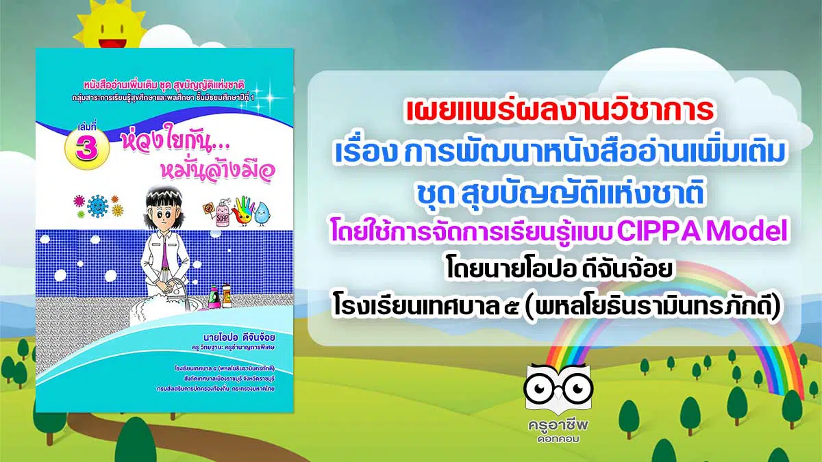 เผยแพร่ผลงานวิชาการ เรื่อง การพัฒนาหนังสืออ่านเพิ่มเติม ชุด สุขบัญญัติแห่งชาติ โดยใช้การจัดการเรียนรู้แบบ CIPPA Model เพื่อส่งเสริมพฤติกรรมด้านสุขนิสัยของนักเรียน ชั้นมัธยมศึกษาปีที่ 1 กลุ่มสาระการเรียนรู้สุขศึกษาและพลศึกษา โดยนายโอปอ ดีจันจ้อย โรงเรียนเทศบาล ๕ (พหลโยธินรามินทรภักดี)