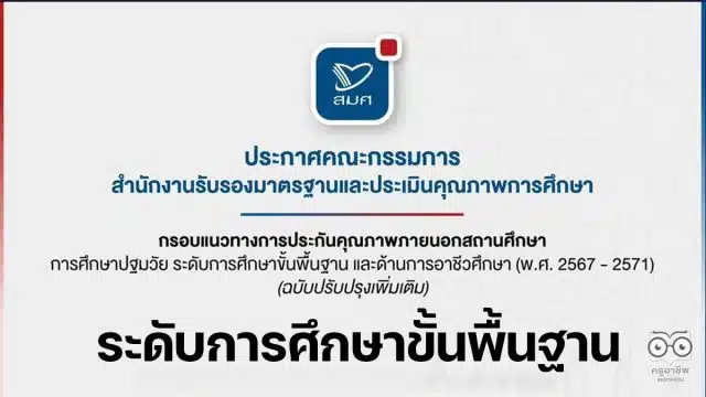 ประกาศคณะกรรมการสานักงานรับรองมาตรฐานและประเมินคุณภาพการศึกษา เรื่อง เรื่อง กรอบแนวทางการประกันคุณภาพภายนอกสถานศึกษา การศึกษาปฐมวัย ระดับการศึกษาขั้นพื้นฐาน การศึกษานอกระบบและการศึกษาตามอัธยาศัย และด้านการอาชีวศึกษา ฉบับลงวันที่ 28 เมษายน พ.ศ. 2566