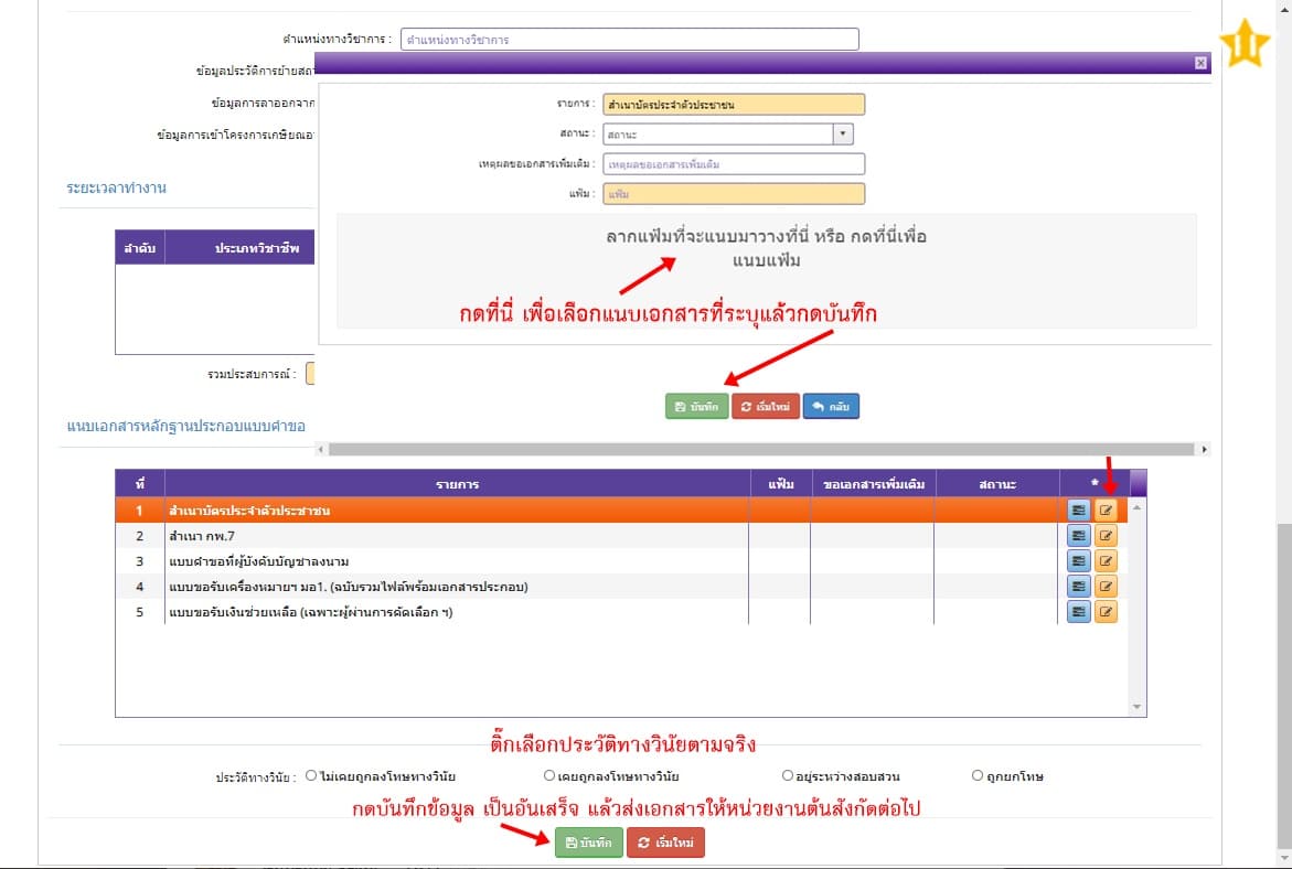 10. การแนบเอกสารประกอบให้เลือกตรงเมนูแถบสีส้มตามลูกศรดังภาพ จะปรากฏกล่องข้อความ ให้เลือกแนบเอกสารตามรายการที่ระบุ แล้วกดบันทึก แนบให้ครบตามหัวข้อทุกหัวข้อ เว้นแบบขอรับเงินให้ส่งเอกสารที่ต้นสังกัด จากนั้น ติ๊กเลือกประวัติทางวินัยตามข้อมูลจริง แล้วกดบันทึกเป็นอันเสร็จ ส่งเอกสารทั้งหมดพร้อมบัญชีรายชื่อผู้ขอรับเครื่องหมายเชิดชูเกียรติฯ ไปยังหน่วยงานต้นสังกัดเพื่อดำเนินการต่อไป