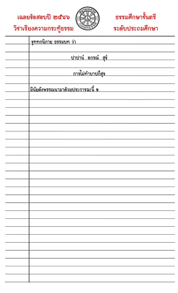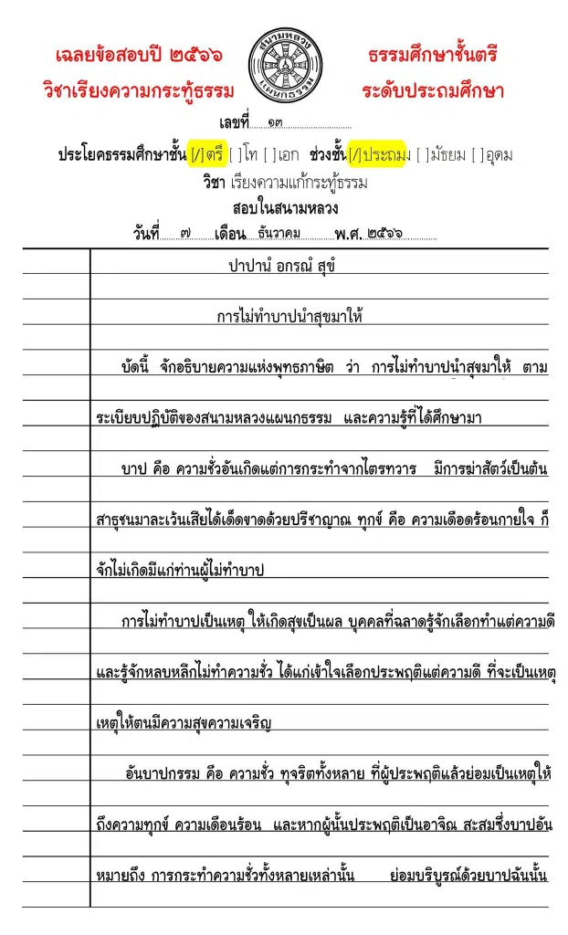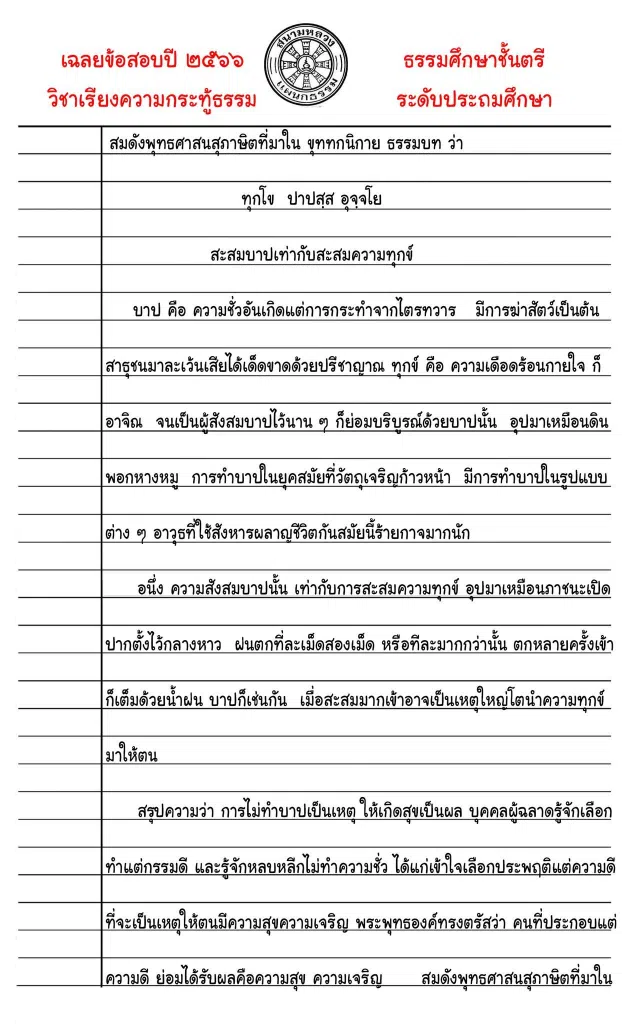 เฉลยข้อสอบ การเขียนเรียงความแก้กระทู้ธรรม ธ.ศ.ตรี ประถมศึกษา ปี ๒๕๖๖