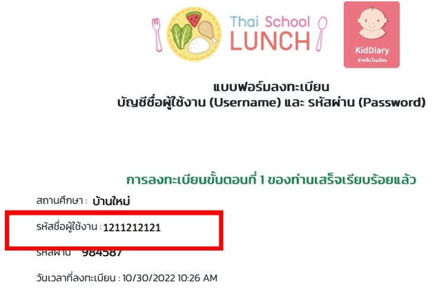 หลังจากลงทะเบียนแล้วท่นจะได้รับชื่อ ผู้ใช้งาน (Username) และรหัสผ่าน (Password) ชุดใหม่ ที่สามารถเข้าใช้งานได้ทั้งในระบU Thai School Lunch และ Kid Diary School โดย ชื่อผู้ใช้งาน (Username) 10 หลักที่ได้จากการลงทะเบียนดังกล่าวจะเป็นรหัสสถานศึกษาที่ได้มาจากระบU DMC หรือ LEC