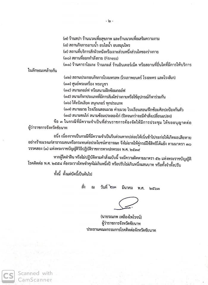 ข้อ ๒ ให้ปิดสถานที่ในพื้นที่จังหวัดชัยนาทเป็นการชั่วคราว ตั้งแต่วันที่ ๒๔ มีนาคม ๒๕๖๓ ถึง วันที่ ๑๔ เมษายน ๒๕๖๓ ดังนี้