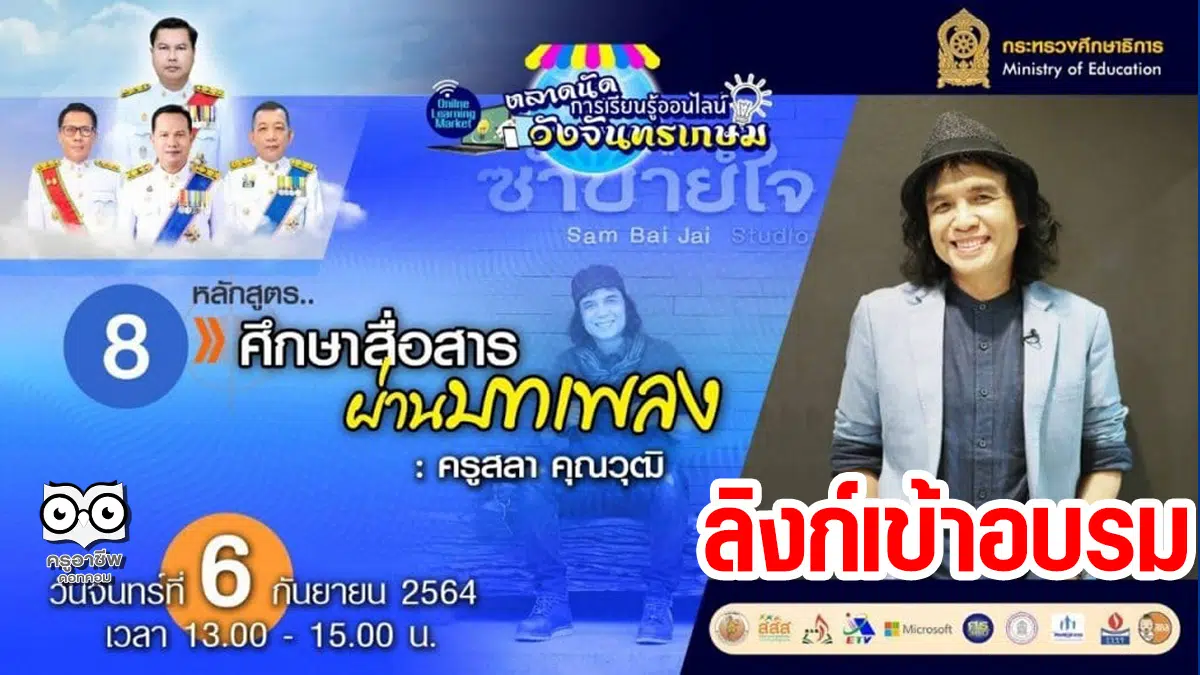 Link เข้าอบรบหลักสูตรที่ 8 ศึกษาสื่อสารผ่านบทเพลงโดย ครูสลา คุณาวุฒิ วันจันทร์ ที่ 6 กันยายน 2564 เวลา 13:00-15:00 น.