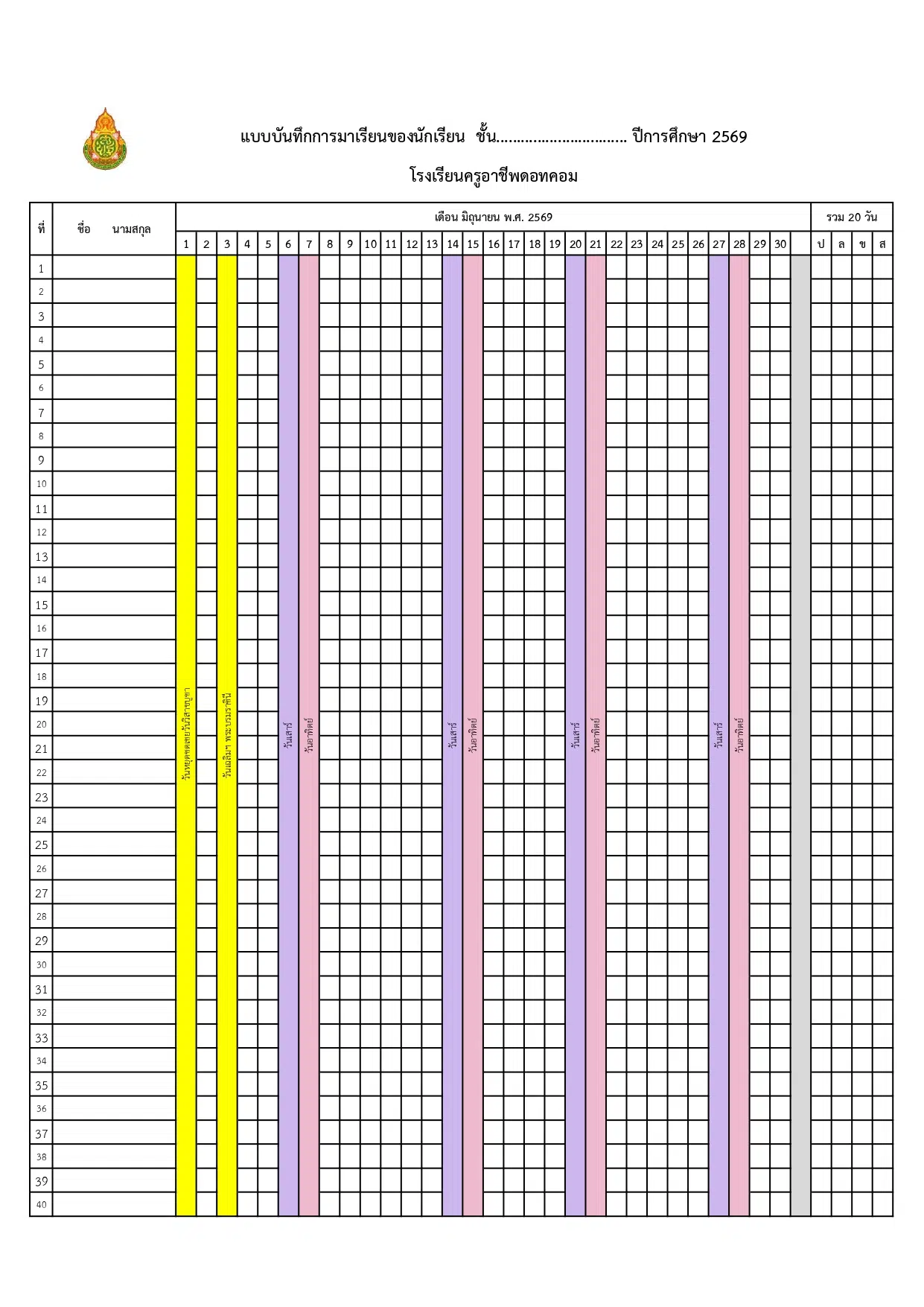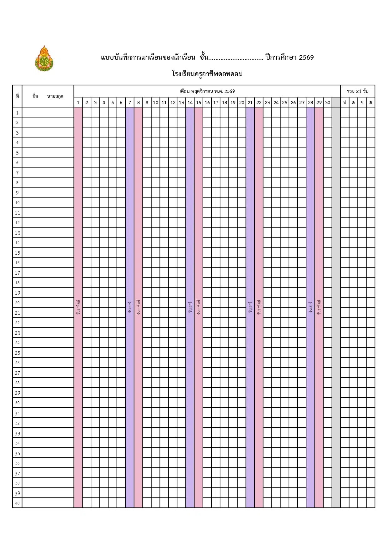 แจกฟรี!! แบบบันทึกการมาเรียนของนักเรียน สมุดเช็คชื่อ ปีการศึกษา 2569 ภาคเรียนที่ 1-2 ไฟล์ Excel แก้ไขได้ พร้อมปก