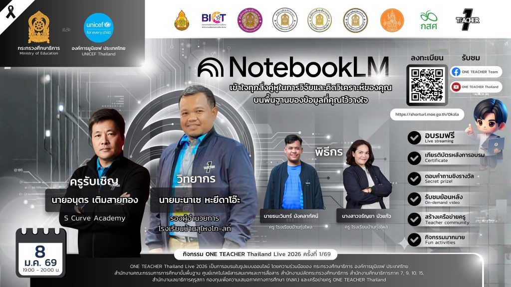 ขอเชิญชวนคณะครูและบุคลากรทางการศึกษา ทุกสังกัด ทุกจังหวัด ร่วมกิจกรรมอบรมเชิงปฏิบัติการ ในรูปแบบออนไลน์ ONE TEACHER Thailand Live 2026 โดยจัดอบรมระหว่าง ม.ค. – เม.ย. 2569