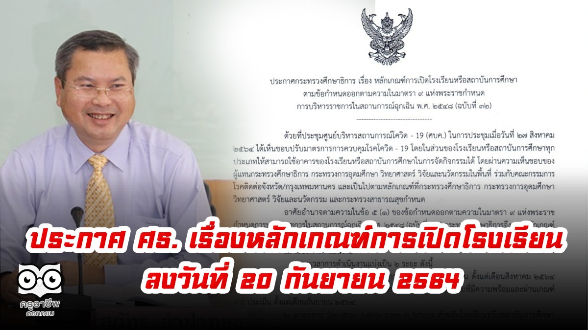 ประกาศ ศธ. เรื่องหลักเกณฑ์การเปิดโรงเรียน ตามข้อกำหนด ในพ.ร.ก. ฉุกเฉิน พ.ศ. 2548 (ฉบับที่ 32) ลงวันที่ 20 กันยายน 2564