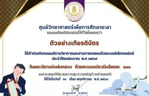 แบบทดสอบออนไลน์ เรื่อง วันพระบิดาแห่งฝนหลวง ผ่านเกณฑ์ 60% รับเกียรติบัตรออนไลน์ทางอีเมล โดยศูนย์วิทยาศาสตร์เพื่อการศึกษายะลา