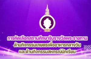 การคัดเลือกสถานศึกษาดีเด่นเพื่อเข้ารับรางวัลพระราชทาน ในด้านกิจกรรมส่งเสริมพัฒนาการ โภชนาการ และสุขภาพอนามัย ด้านกิจกรรมเกษตรเพื่ออาหารกลางวัน และด้านกิจกรรมสหกรณ์นักเรียน ภายใต้โครงการพัฒนาเด็กและเยาวชน ในถิ่นทุรกันดาร ตามพระราชดำริ