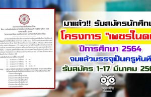มาแล้ว!! รับสมัครนักศึกษา โครงการ “เพชรในตม” ปีการศึกษา 2564 จบแล้วบรรจุเป็นครูทันที รับสมัคร 1-17 มีนาคม 2564