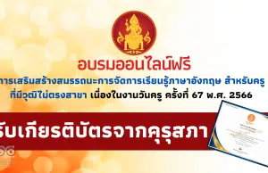 อบรมออนไลน์ฟรี หลักสูตร การเสริมสร้างสมรรถนะการจัดการเรียนรู้ภาษาอังกฤษ สำหรับครูที่มีวุฒิไม่ตรงสาขา ระดับประถมศึกษา เนื่องในวันครู 2566 รับเกียรติบัตร 30 ชั่วโมง จากคุรุสภา...