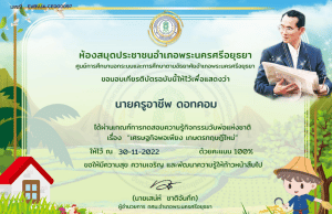 แบบทดสอบออนไลน์ กิจกรรมวันพ่อแห่งชาติ เรื่อง เศรษฐกิจพอเพียง เกษตรทฤษฎีใหม่ ผ่าน 70% ขึ้นไป ท่านจะได้รับเกียรติบัตรทางอีเมล โดยห้องสมุดประชาชนอำเภอพระนครศรีอยุธยา