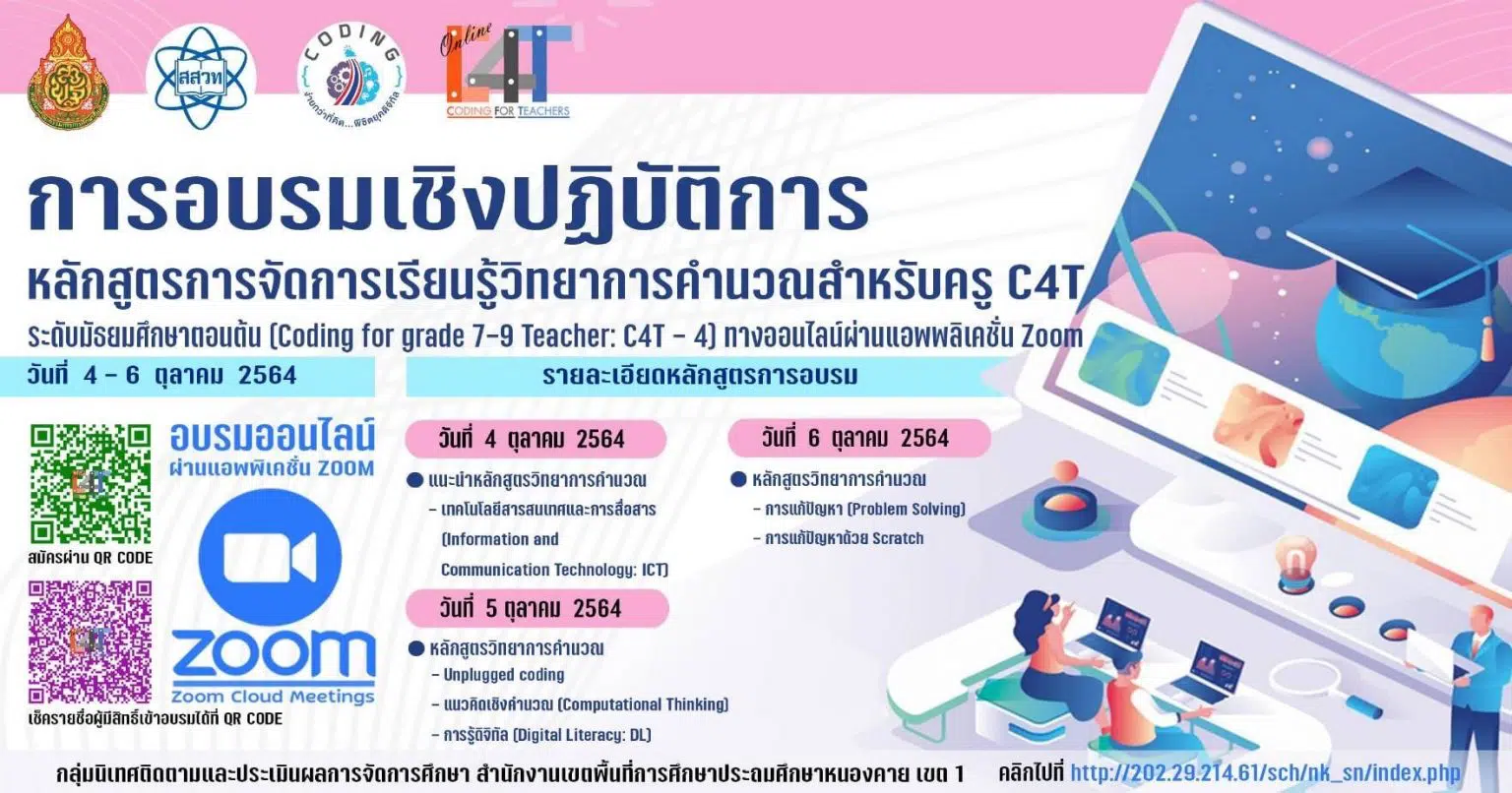 สพป หนองคาย เขต 1 ขอเชิญลงทะเบียนการอบรมเชิงปฏิบัติการหลักสูตรการจัดการเรียนรู้วิทยาการคำนวณสำหรับครู C4T ระดับมัธยมศึกษาตอนต้น วันที่ 4-6 ตุลาคม 2564 อบรมออนไลน์ผ่านแอพพลิเคชั่น Zoom
