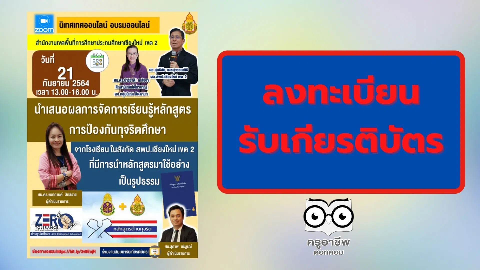 ลงทะเบียนรับเกียรติบัตรกิจกรรม นำเสนอการจัดการหลักสูตรป้องกันทุจริตศึกษา วันที่ 21 กันยายน 2564 เวลา 13.00 - 16.00 น. จัดโดย สพป.เชียงใหม่ เขต 2