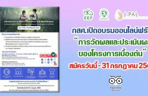 กสศ. จัดอบรมเชิงปฏิบัติการแบบออนไลน์ ในหัวข้อ “การวัดผลและประเมินผลของโครงการเบื้องต้น” สมัครเข้าร่วมได้ ตั้งแต่วันนี้ – 31 กรกฎาคม 2564...