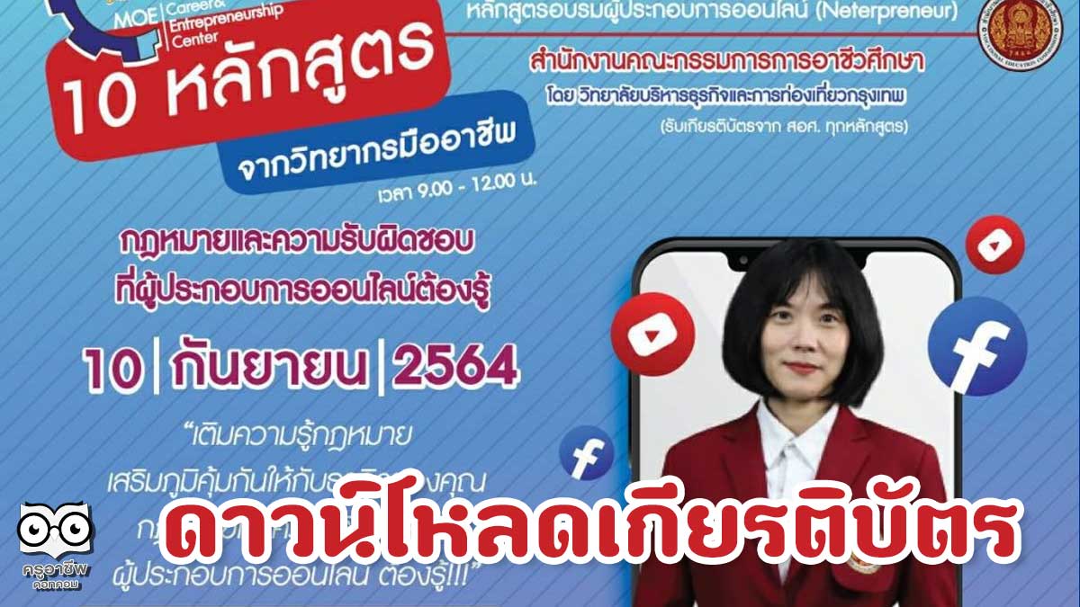 ลิงก์ลงทะเบียน อบรมออนไลน์ หลักสูตร กฎหมายและความรับผิดชอบที่ผู้ประกอบการออนไลน์ต้องรู้ วันที่ 10 กันายายน 64 เวลา 09.00 น. รับเกียรติบัตรฟรี จาก สอศ.