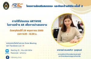 ขอเชิญอบรมออนไลน์ เรื่อง การใช้โปรแกรม Artivive ในการสร้าง AR เพื่อนำเสนองาน วันพฤหัสบดีที่ 26 พฤษภาคม 2565 เวลา 9.00 น. – 12.00 น. รับเกียรติบัตรฟรี โดยสำนักวิทยบริการฯ มรภ.เทพสตรี