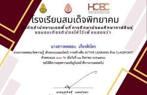 แบบทดสอบออนไลน์ เรื่อง การสร้างสื่อ ACTIVE LEARNING ด้วย CLASSPOINT ผ่านเกณฑ์ 60% รับเกียรติบัตรทันที โดยศูนย์ HCEC โรงเรียนสมเด็จพิทยาคม