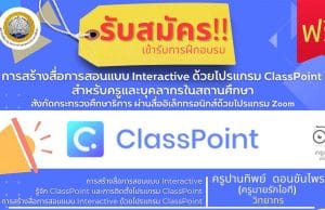 ขอเชิญลงทะเบียนอบรมฟรี!! หลักสูตร การสร้างสื่อการสอนแบบ Interactive ด้วยโปรแกรม ClassPoint สำหรับครูและบุคลากรในสถานศึกษา สังกัดกระทรวงศึกษาธิการ ผ่านสื่ออิเล็กทรอนิกส์ด้วยโปรแกรม Zoom โดยสถาบันพัฒนาครู สคบศ.