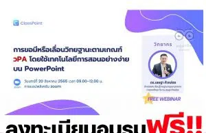 ลิงก์ลงทะเบียน รับเกียรติบัตรฟรี!! สัมมนาการใช้งานโปรแกรม ClassPoint สำหรับผู้เริ่มต้น วันพฤหัสบดีที่ 12 พฤษภาคม 2565 เวลา 18.00-19.30 น.